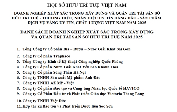 DOANH NGHIỆP XUẤT SẮC TRONG XÂY DỰNG VÀ QUẢN TRỊ TÀI SẢN SỞ HỮU TRÍ TUỆ - THƯƠNG HIỆU, NHÃN HIỆU UY TÍN HÀNG ĐẦU - SẢN PHẨM, DỊCH VỤ VÀNG UY TÍN, CHẤT LƯỢNG VIỆT NAM NĂM 2025